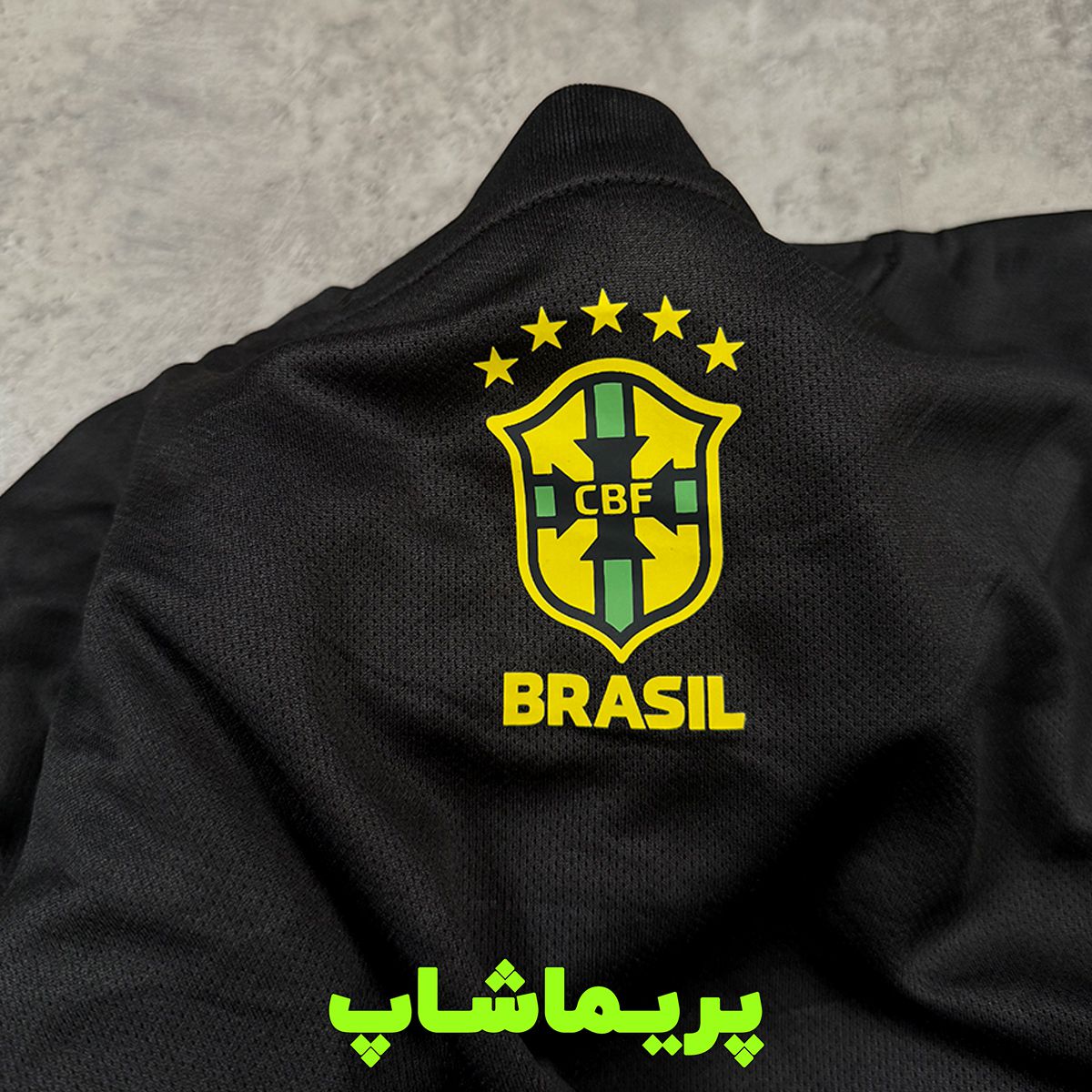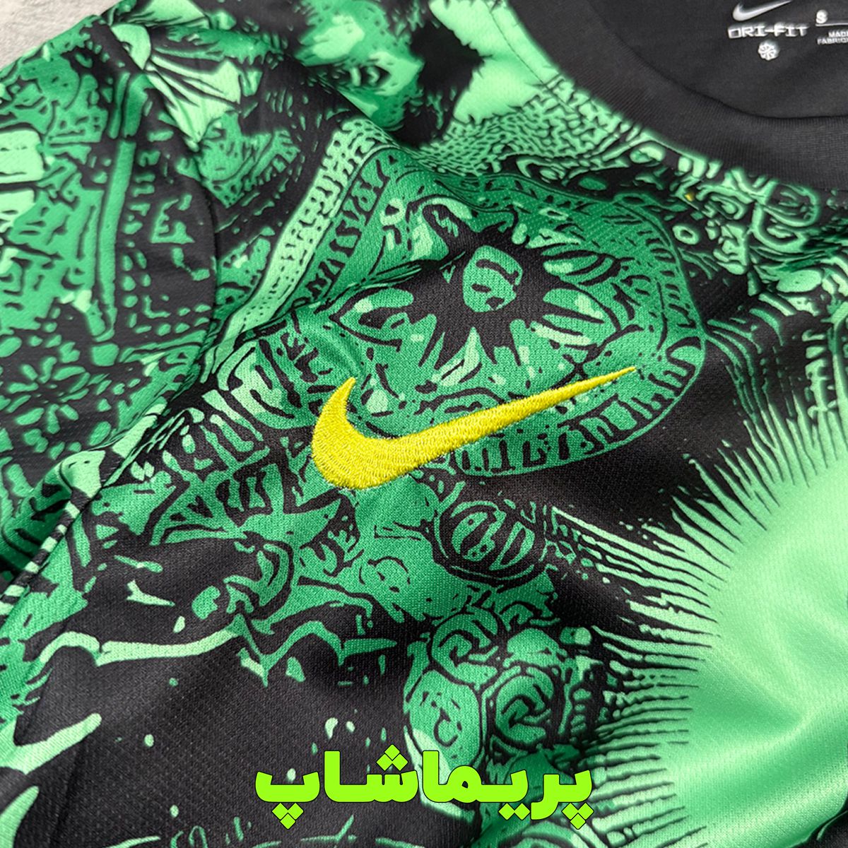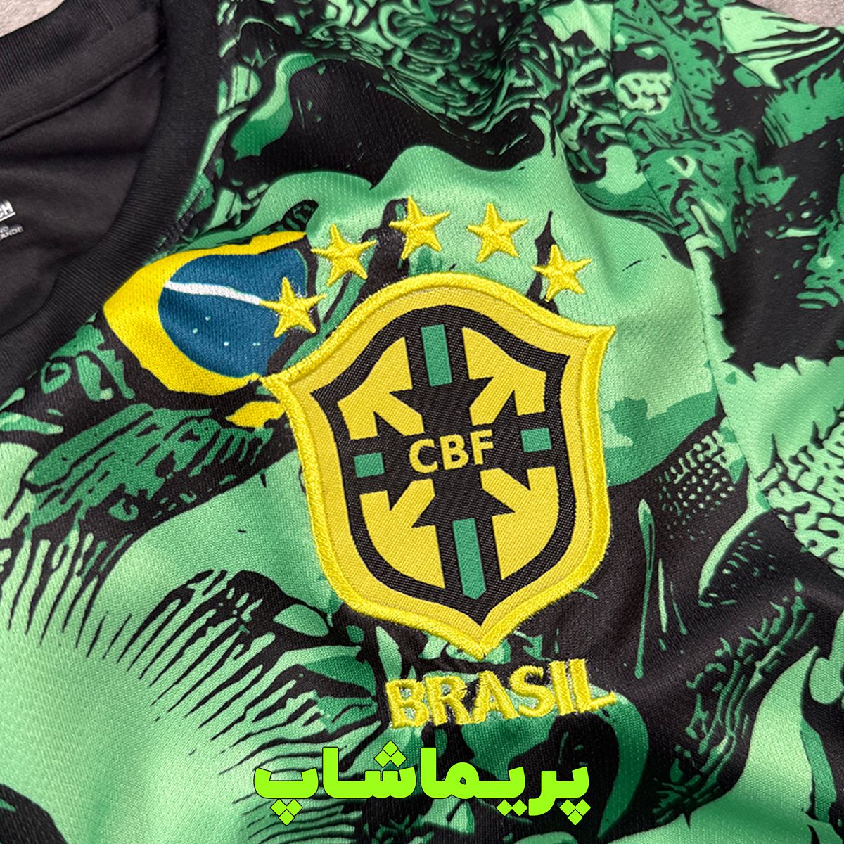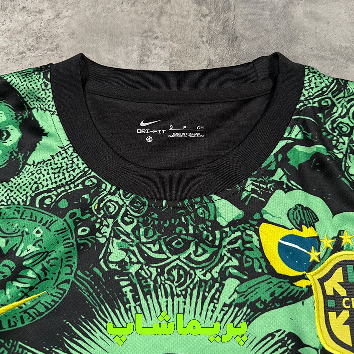 لوگوی برزیل روی پیراهن دوخته شده و برند نایک با تراکم بالا گلدوزی شده.