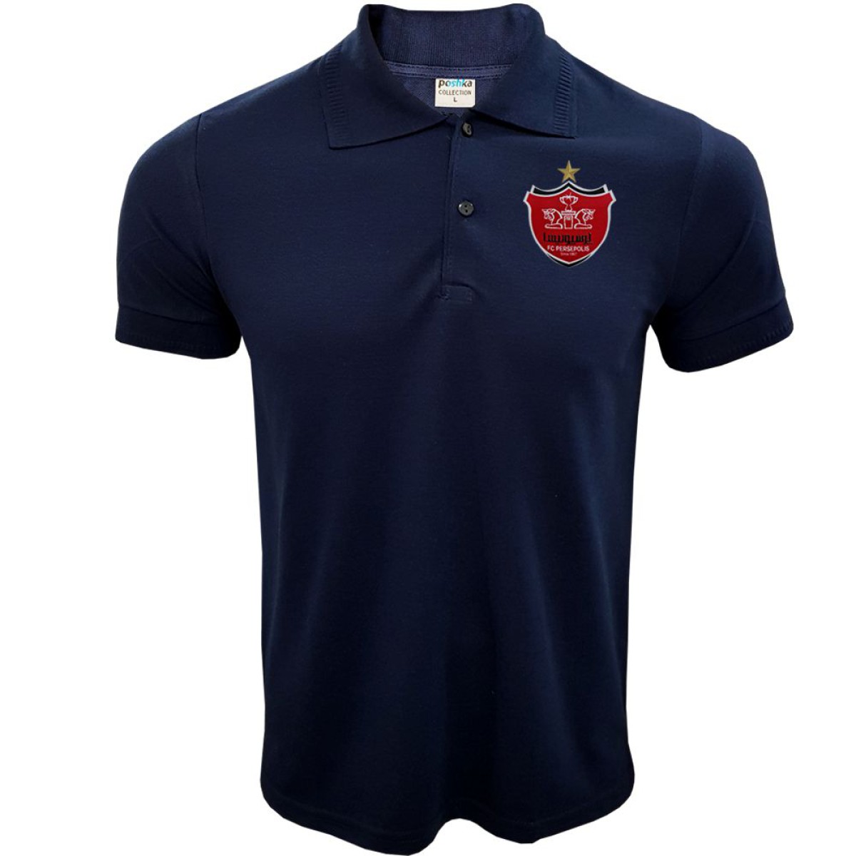 یقه و سرآستین های پولوشرت پرسپولیس سرمه ای با اسپانسر از کشباف با کیفیت کار شده.