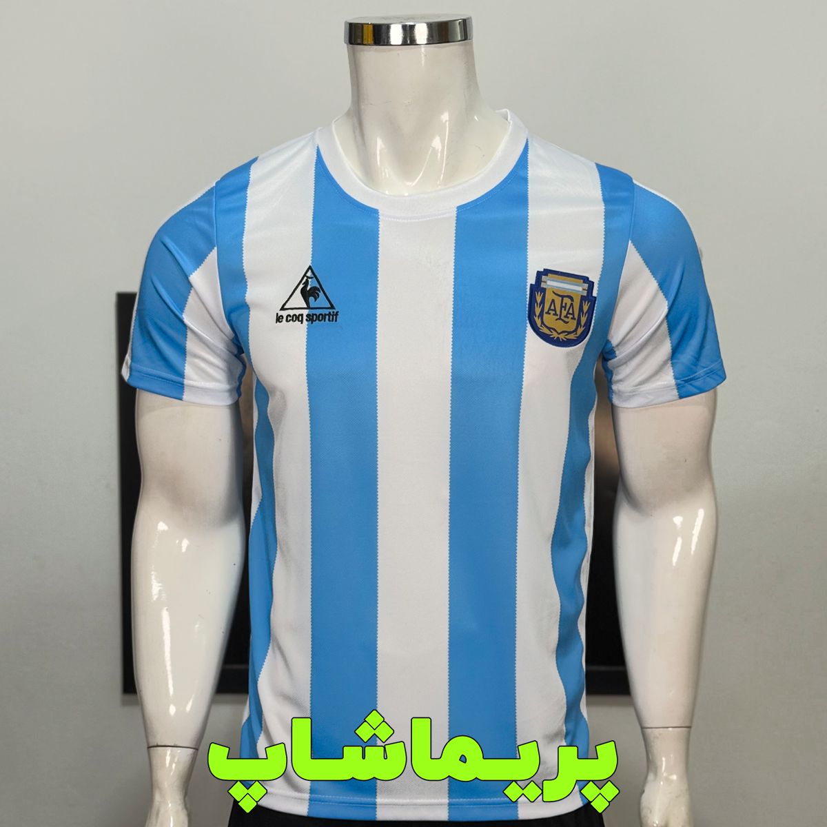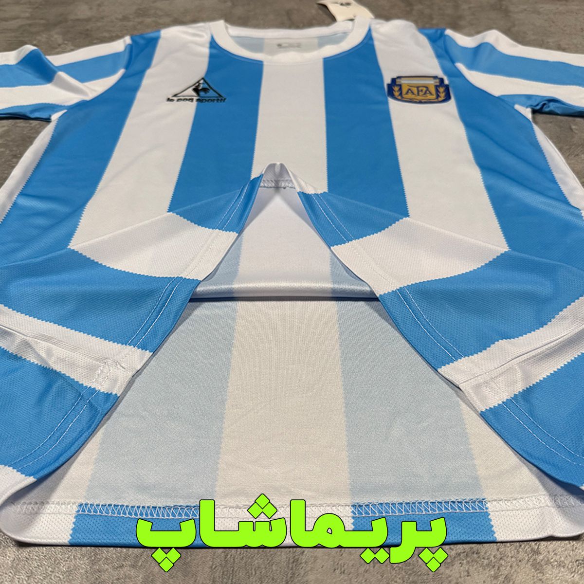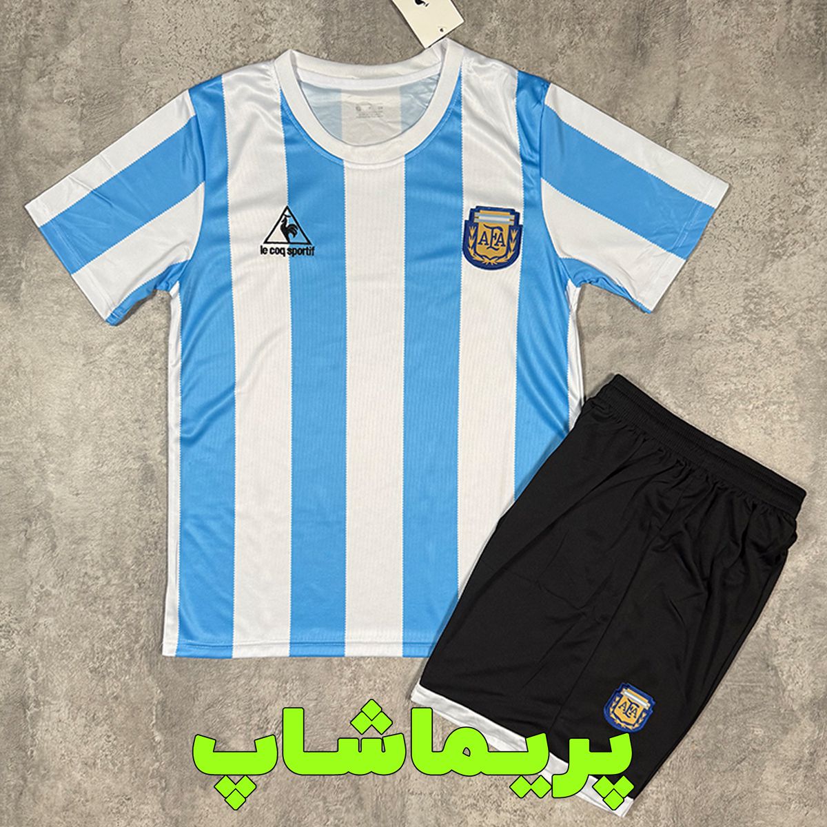 کیت آرژانتین 1986 با پارچه سوزنی و سبک و یه طراحی ظاهری عالی در فروشگاه موجود شده. این ست دارای شورت مشکی با نوار سفید در پایینش هست که کنار اون کار شده و ست قشنگی رو مهیا کرده.