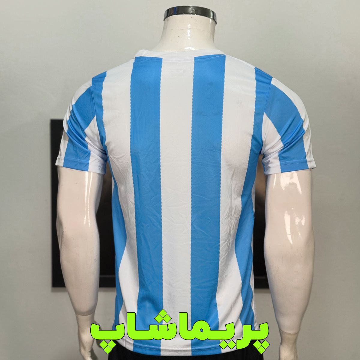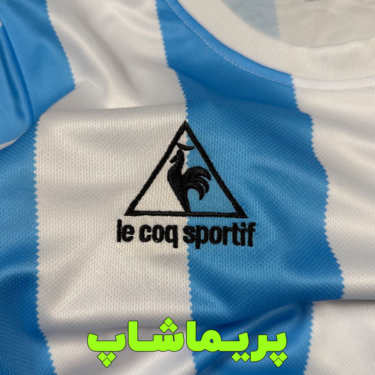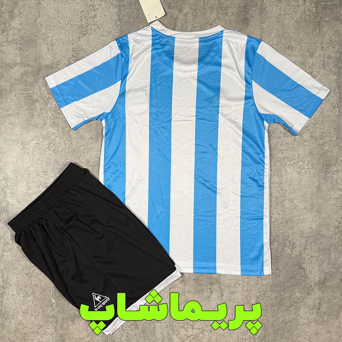 کیت آرژانتین 1986 با پارچه سوزنی و سبک و یه طراحی ظاهری عالی در فروشگاه موجود شده. این ست دارای شورت مشکی با نوار سفید در پایینش هست که کنار اون کار شده و ست قشنگی رو مهیا کرده.