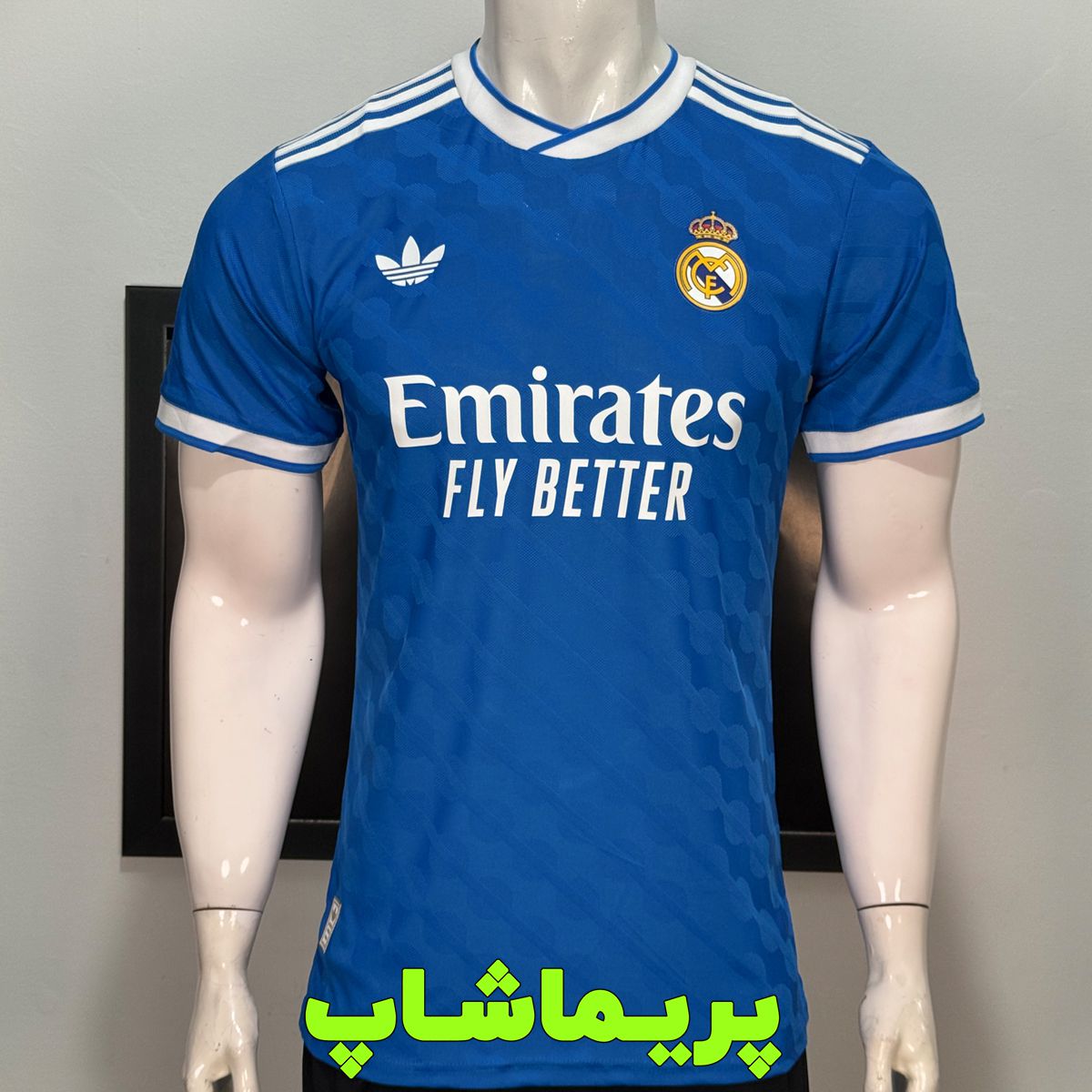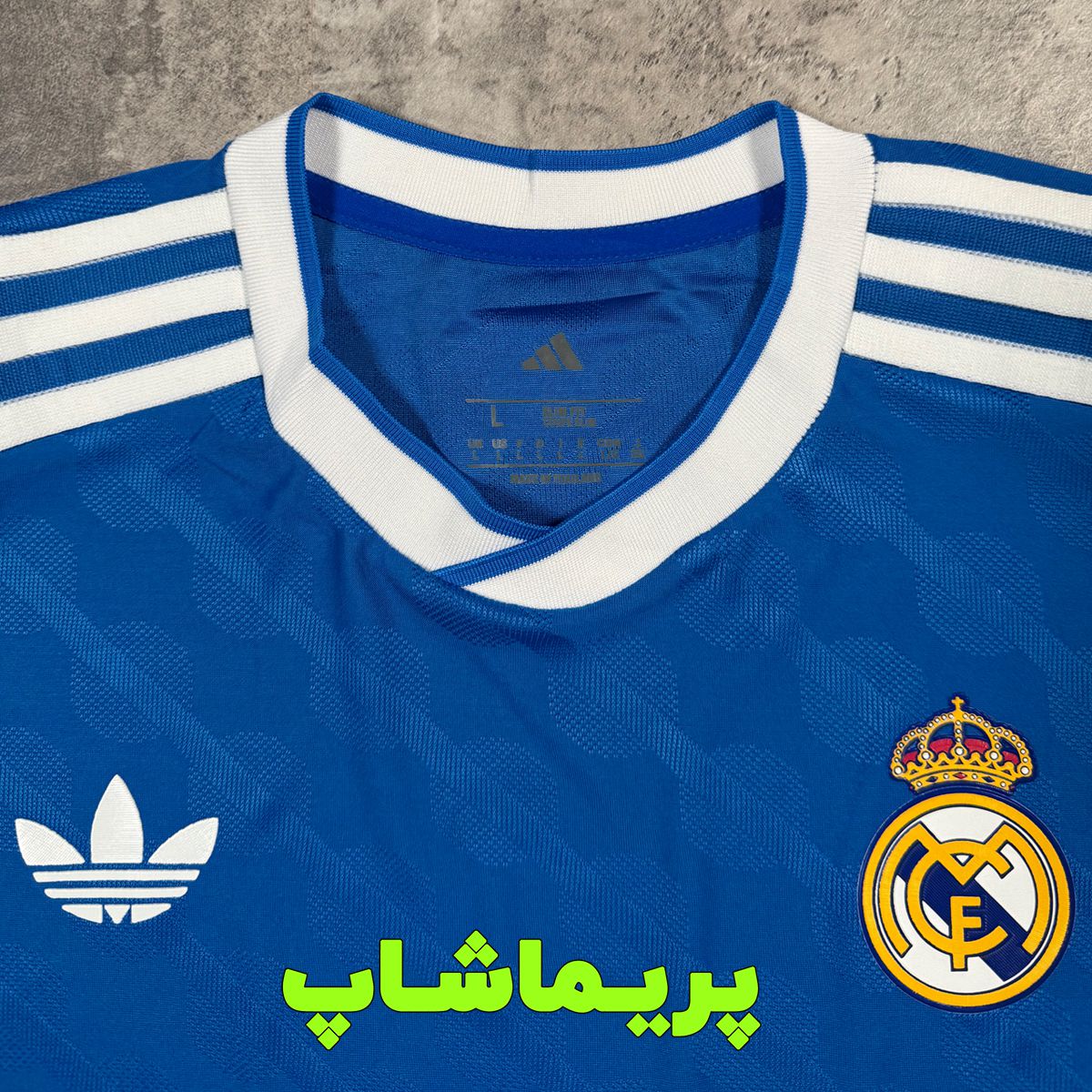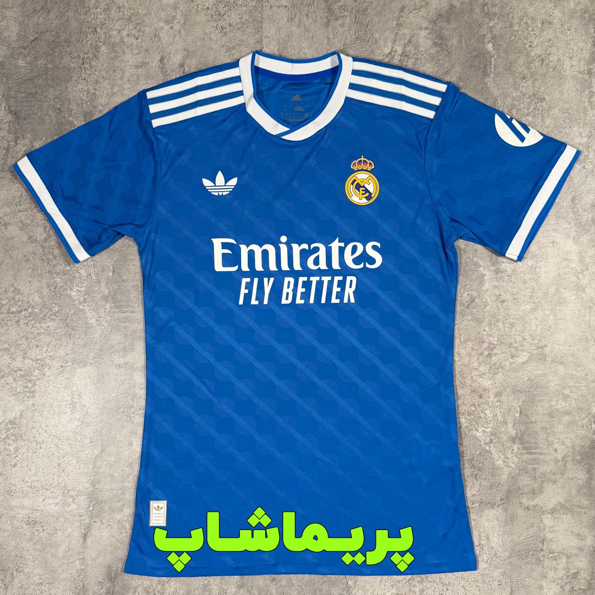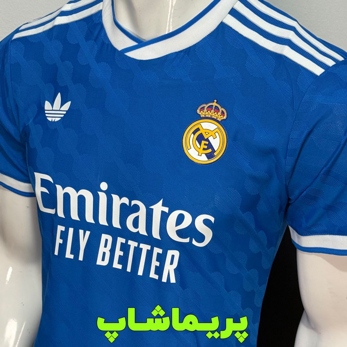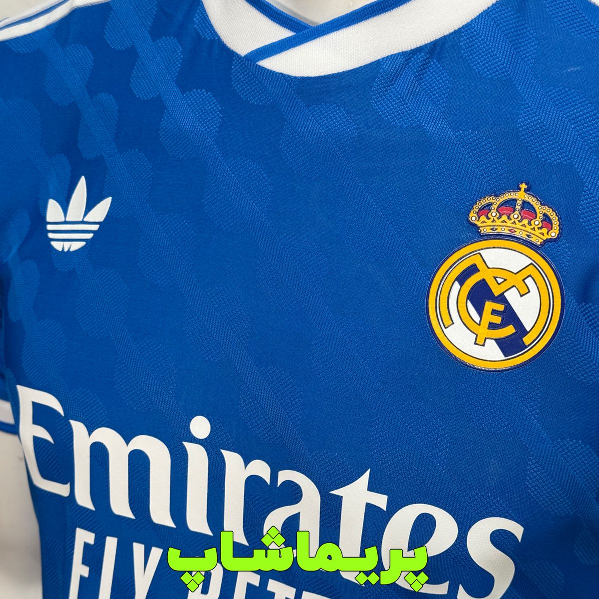 لوگوی پیراهن و برند آدیداس روی لباس سوم رئال مادرید به صورت پرسی هستن که جنسشون ژلاتینی هست.