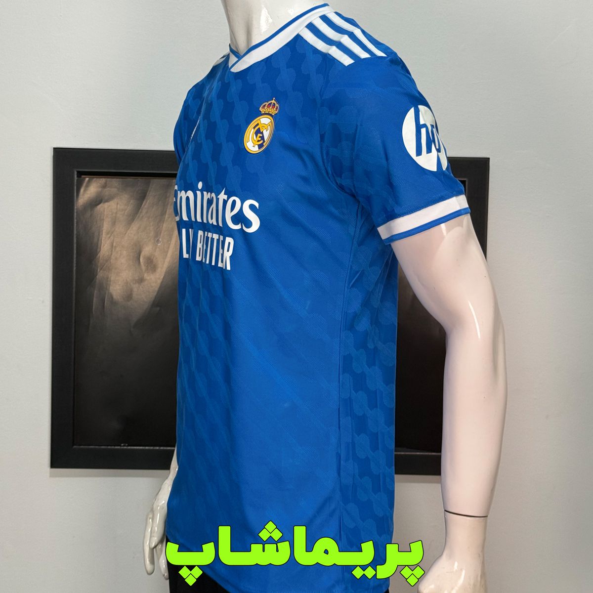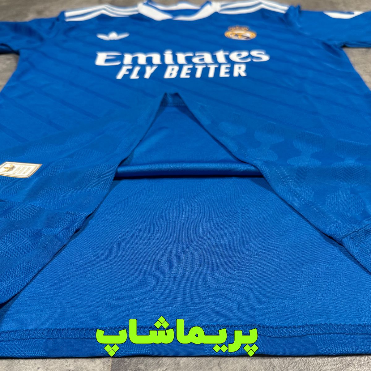 سه خط آدیداس روی سرشانه با اسپانسر emirates fly better یک جنس هست.